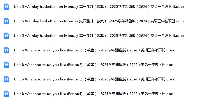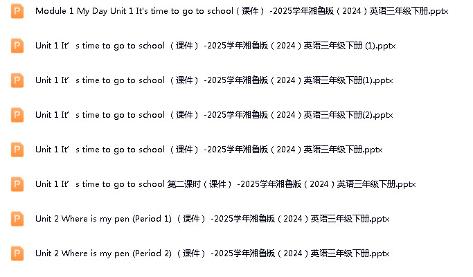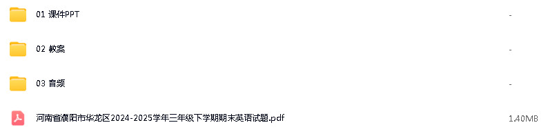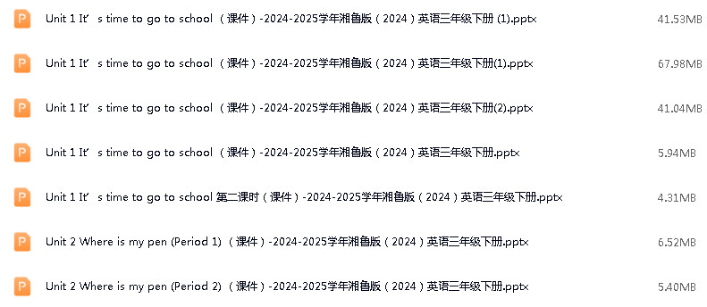 资源名称:鲁教湘教版(三年级起点)(2024)小学英语三年级下册(2024)成套ppt课件+教案+音频素材+期末试题参考汇编